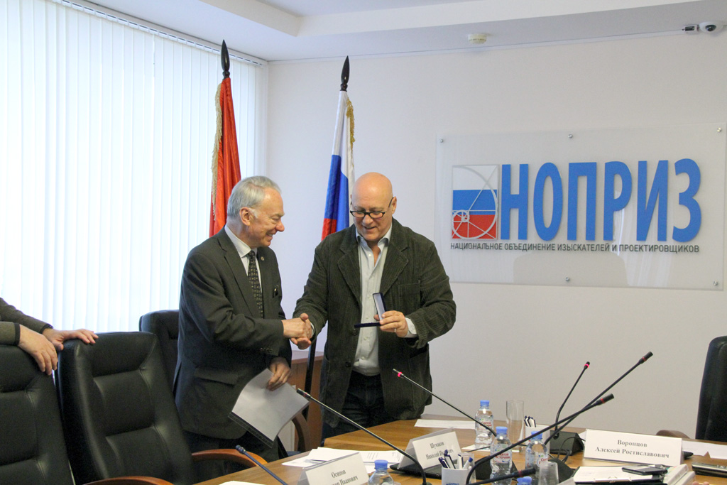 В завершающей части работы Комитета Алексей Воронцов вручил Нагрудный знак Национального объединения изыскателей и проектировщиков за особые заслуги в профессиональной деятельности в области архитектурно-строительного проектирования Виктору Осипову.