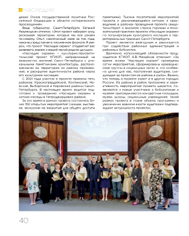 Разумишкин отметил: «Этот проект набирает силу, жительной практике проекта «Наследие окраин» ежегодно в рамках фестиваля КГИОП «Миссия – достью».