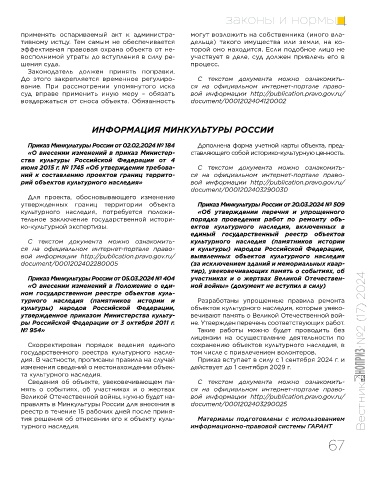 «Об объектах культурного наследия (памятни- границ территории исторического поселения» Приказ Минкультуры России от 02.02.2024 № 184 Дополнена форма учетной карты объекта, пред-